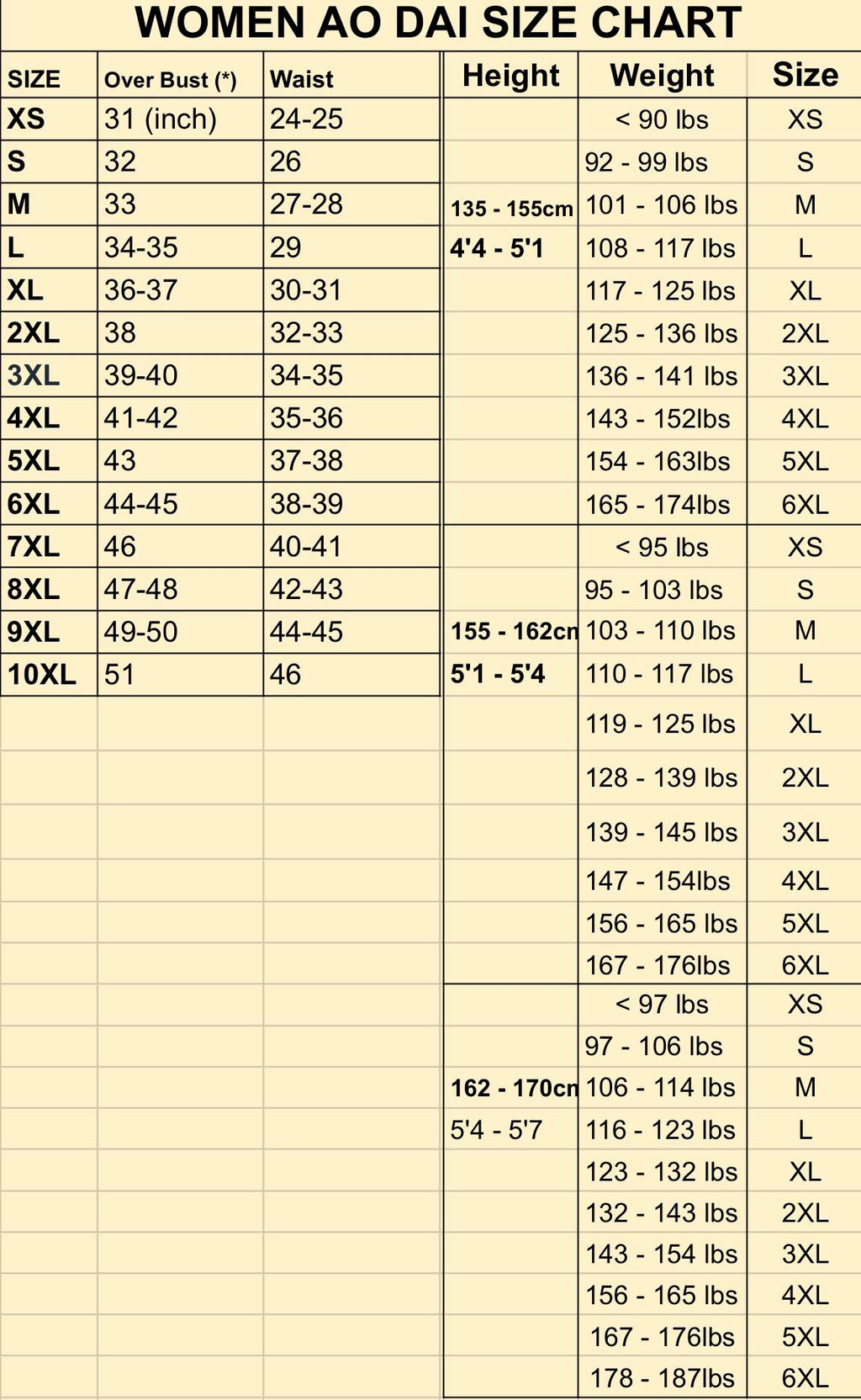 Áo dài: Tơ (2 layers). No stretchy, 1 size up recommended.